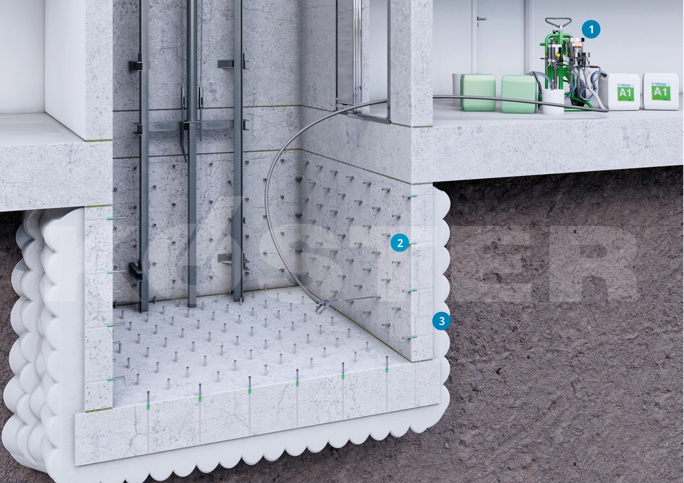 V gradbeni element po površini razporedimo injektirne nastavke tako, da tvorijo mrežo. KÖSTER Injektirni gel G4 v več fazah preko injektirnih nastavkov injektiramo na zunanjo stran stene, kjer gel tvori zaveso, s tem pa gradbeni element loči od podtalne vode ter ga tako hidroizolira z zunanje (pozitivne) strani. Prav za to področje uporabe je izdelek KÖSTER Injektirni gel G4 pridobil certifikat – splošno tehnično soglasje s strani Nemškega inštituta za gradbeništvo (DIBt). V primeru, da se skozi odprtine ali velike vrzeli za steno izgublja preveč materiala, je mogoče bolje uporabiti gel s hitrejšo reakcijo KÖSTER Injektirni gel S4.