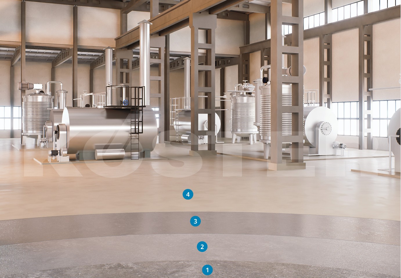 Jeklene površine morajo biti površinsko suhe, čiste in ne smejo vsebovati olja ali maščobe. Priprava mora ustrezati standardom DIN ISO 12944-4, s peskanjem do čistosti vsaj SA 2 ½ in povprečne hrapavosti vsaj 50 μm, ali ročno z jekleno krtačo do SA 3. Zvarne kaplice in šive je treba odstraniti, robove pa zagladiti z brušenjem. Alternativno lahko popravke naredimo s KÖSTER CT 228 Flex, ki mu dodamo 6% KÖSTER KB-Pox Sredstva za zgoščanje. Na koncu je treba odstraniti ves prah in nečistočo, da zagotovimo čisto površino, pripravljeno za nanos premaza. Za zagotavljanje optimalne zaščite nanesemo KÖSTER CT 228 Flex v dveh slojih.