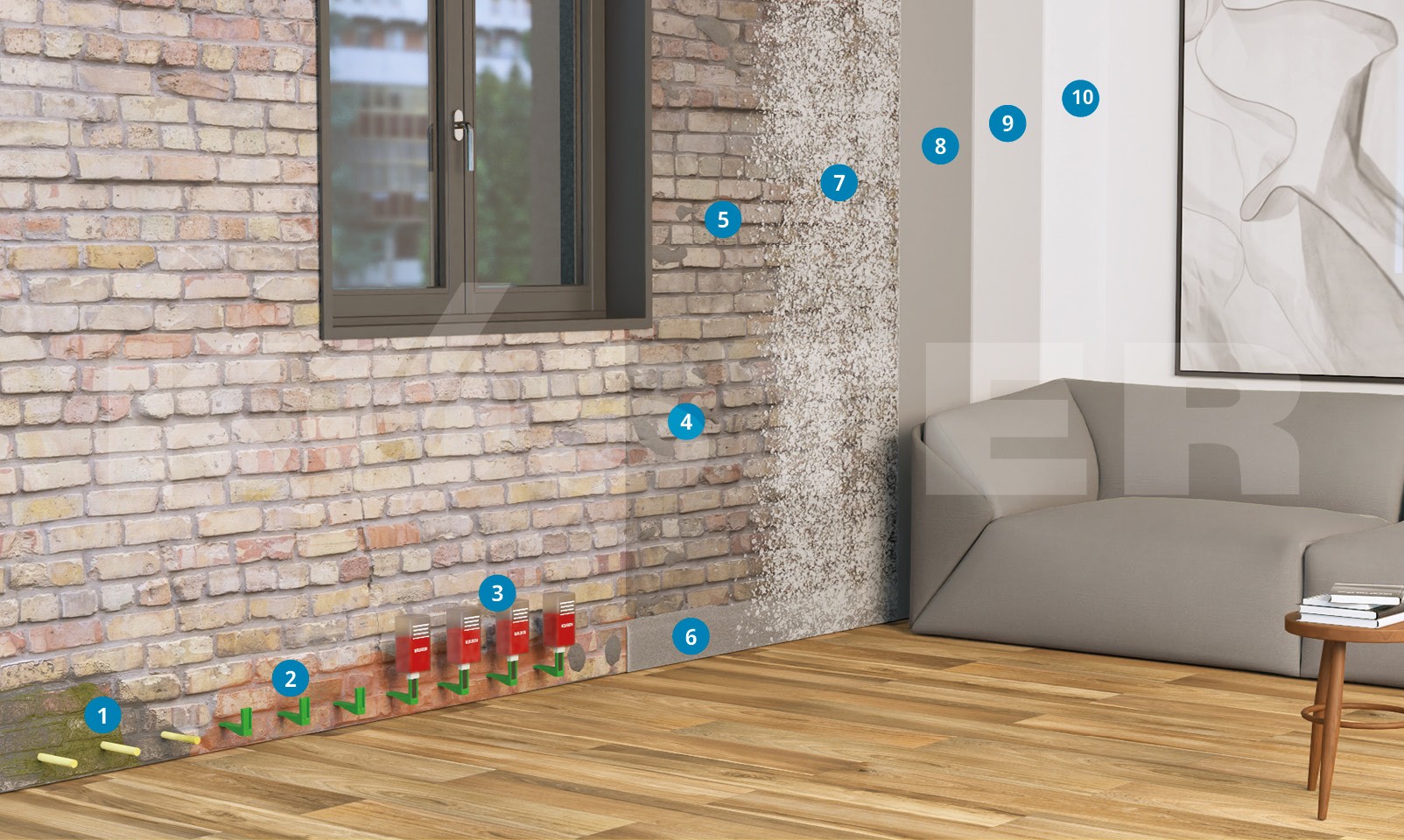 Kadar je zaradi naraščajoče vlage že prišlo do poškodb sten, moramo stare zaključne omete odstraniti. Ko je narejena horizontalna bariera, moramo nanesti še KÖSTER Sanirne omete. KÖSTER Sanirni ometi omogočajo, da se zidovi izsušijo brez kakršnekoli dodatne škode. So paropropustni in hidrofobni. KÖSTER Sanirni ometi izsušijo steno in iz zidov absorbirajo ostanke soli. Tako se sol ne pojavlja na površini in ne poškoduje končnega ometa ali barve.
