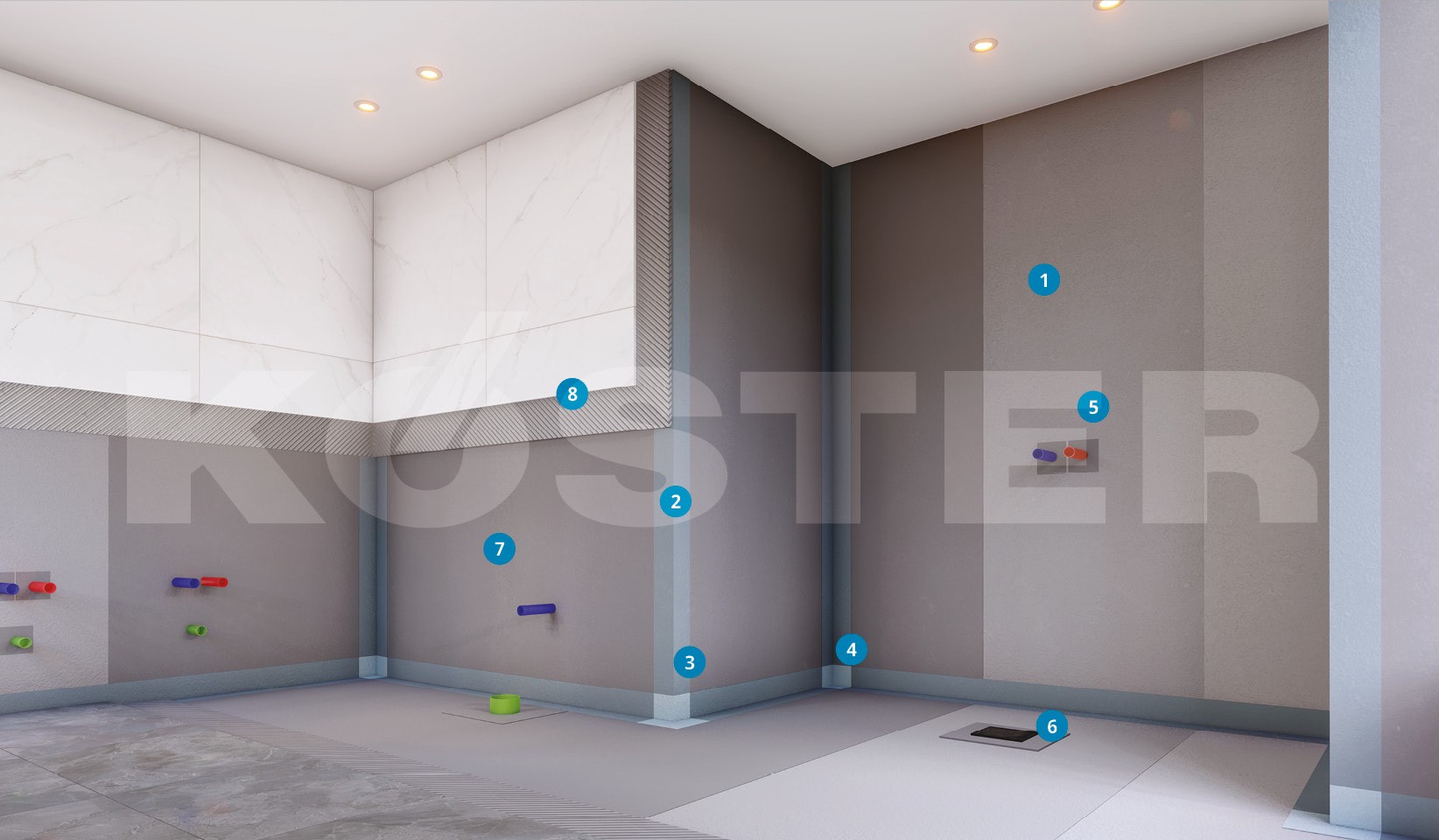 KÖSTER-jev BD Sistem je celovit sistem za tesnjenje pod keramičnimi oblogami v kuhinjah, kopalnicah in ostalih mokrih prostorih. Na pred-pripravljeno suho in zdravo podlago najprej kot predpremaz nanesemo KÖSTER BD 50 Primer. Nanj nato, kot tesnilni sloj, nanesemo KÖSTER BD 50, ki ne vsebuje topil in je enostaven za uporabo.