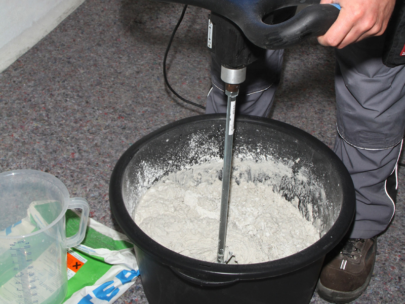 Pro Sack KÖSTER Hydrosilikatkleber SK ca. 5,2 Liter Wasser zugeben und mit einem langsam laufenden Rührwerk zu einer homogenen, klumpenfreien Masse anrühren.