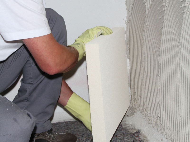 Die KÖSTER Hydrosilikatplatten werden nun auf die Wand gedrückt und dort ausgerichtet. Eine Wasserwaage hilft bei der Ausrichtung.
