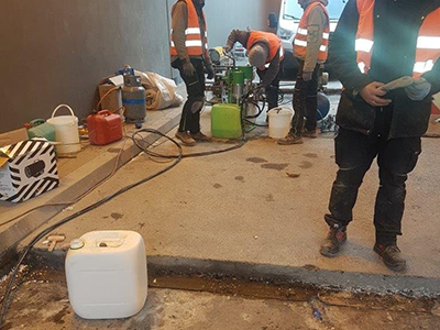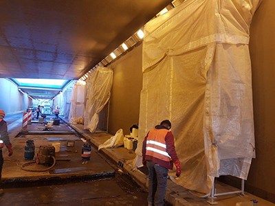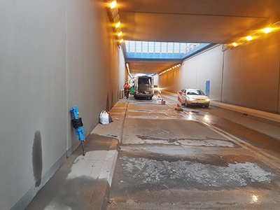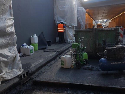 Die Dehnfugen im Bodenplatte und in die Wände waren undicht. Es wurde die Injektion mit KÖSTER Ijnektionsgel G4 in den Bereich zwischen die Abdichtungsbaender geführt. Im zweitem Arbeitsgang wurde die obere Teil des Dehnfuge mit Injektionsgel KÖSTER J4 gefullt. Es wurde ca. 900 kg KÖSTER Injektionsgel G4 verbraucht. Die Dehfuge von oben wurde mit KÖSTER Fugenspachtel FS-H geschlossen. Die Abdichtungsarbeiten waren erst auf eine Halfte die Strasse befuhrt, dann auf die andere.