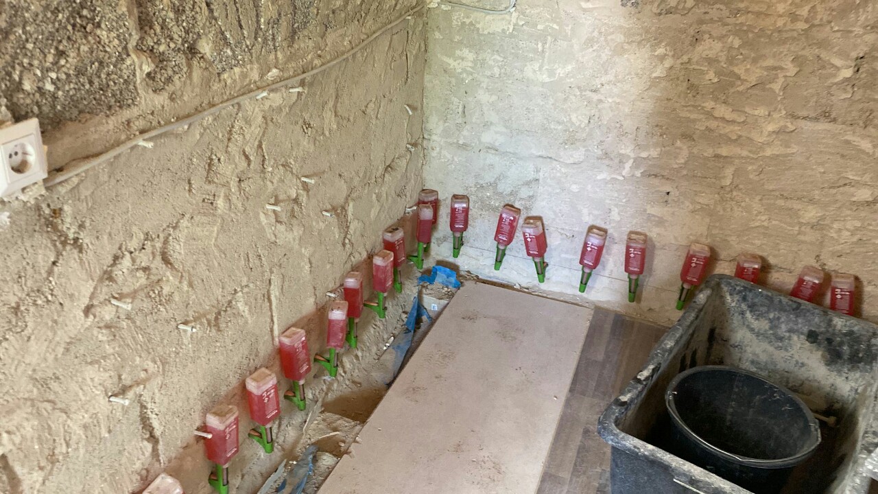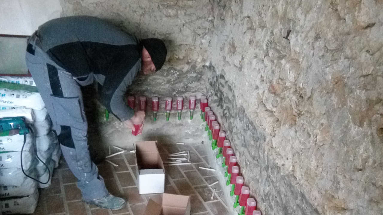 Bezüglich kapillar Aufsteigende Feuchtigkeit wurde hier u.a. eine Horizontalsperre im KÖSTER - Crisin 76 - Kartuschen-System eingebracht.Anschließend wurde die Kellerwände im KÖSTER - Sanierputz - System ( Polysil TG 500, Sperrmörtel WU, NB 1 grau, Sanierputz Spritzbewurf und Sanierputz weiß/leicht ) bearbeitet!Leider liegen hier keine Bilder vor jedoch auf dem beigefügten Bild sieht man links die jeweiligen Paletten stehen!