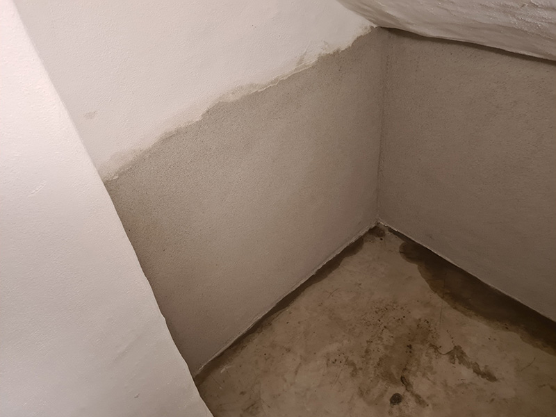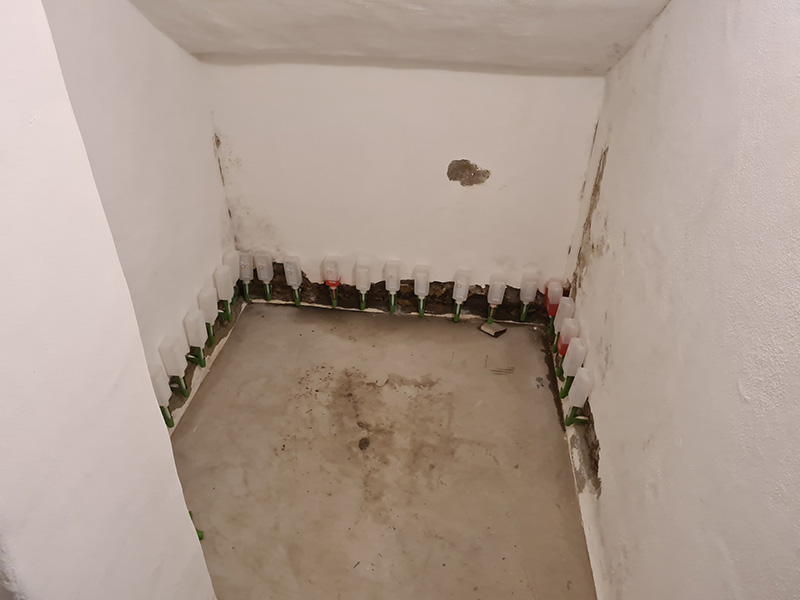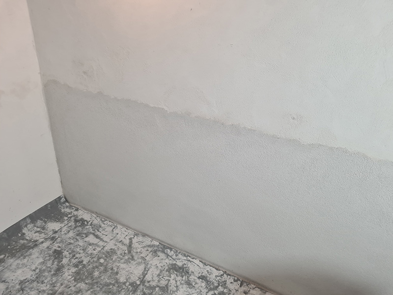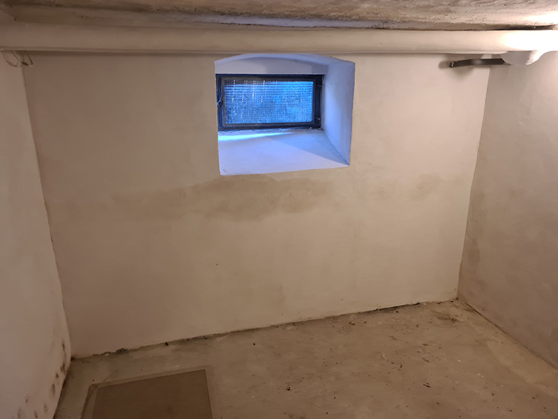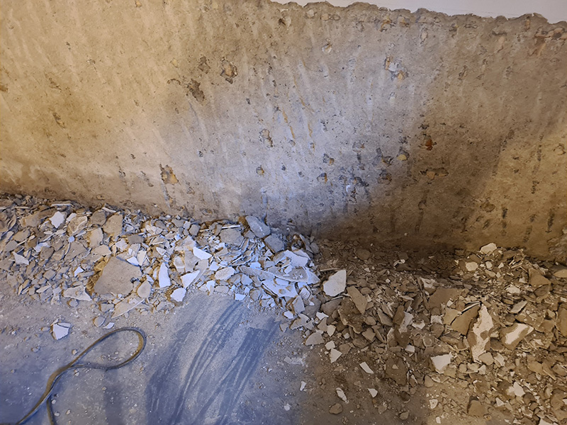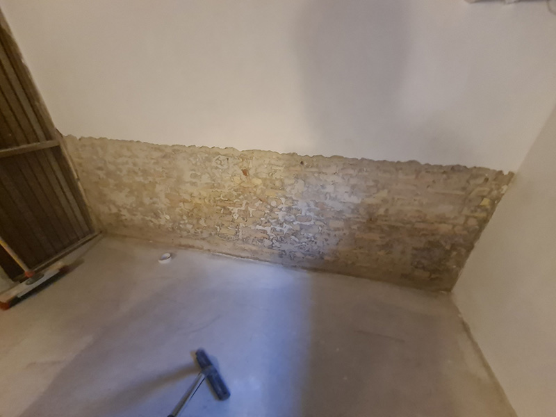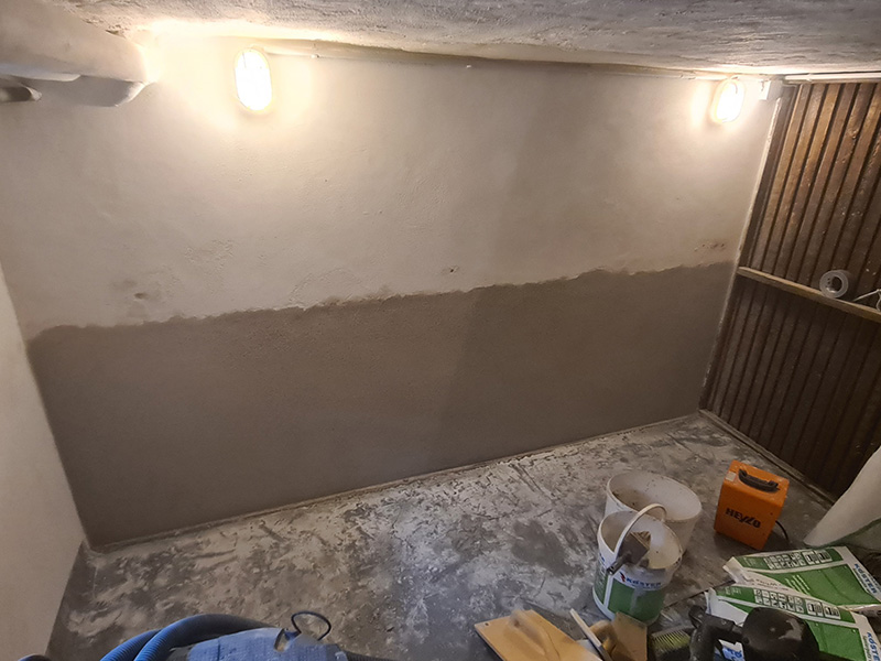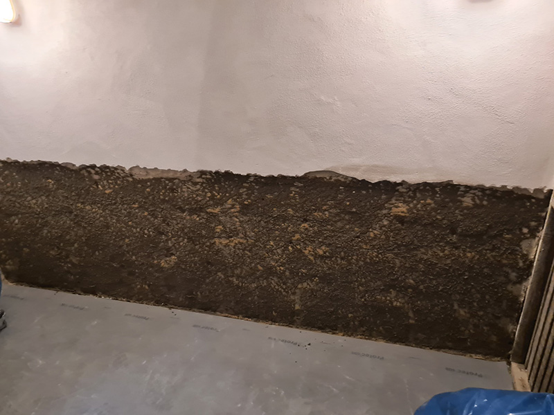 In einem Mehrfamilienhaus wurde von einer anderen Firma eine Innenabdichtung hergestellt. Diese Innenabdichtung und vergessende Horizontalsperre wurden fehlerhaft ausgeführt, sodass die Sanierung nach 3 Jahren wiederholt werden musste. Zunächst wurde der Putz abgeschlagen und entsorgt. Danach wurde eine Horizontalsperre mit KÖSTER Crisin 76 injiziert. Das Mauerwerk wurde gereinigt, mit KÖSTER Polysil TG 500 grundiert und KÖSTER Sanierputz Spritzbewurf als Haftschicht aufgetragen. Um die Salze im Mauerwerk zu binden, wurde abschließend eine 2 cm dicke Lage KÖSTER Sanierputz aufgetragen.