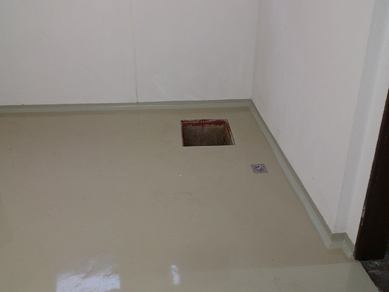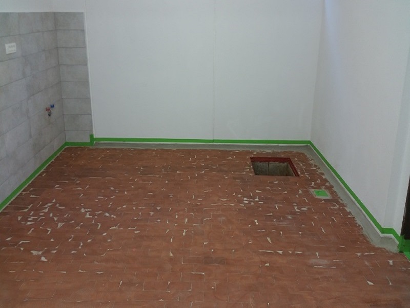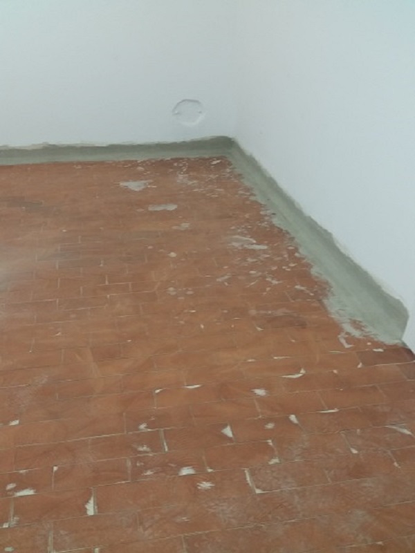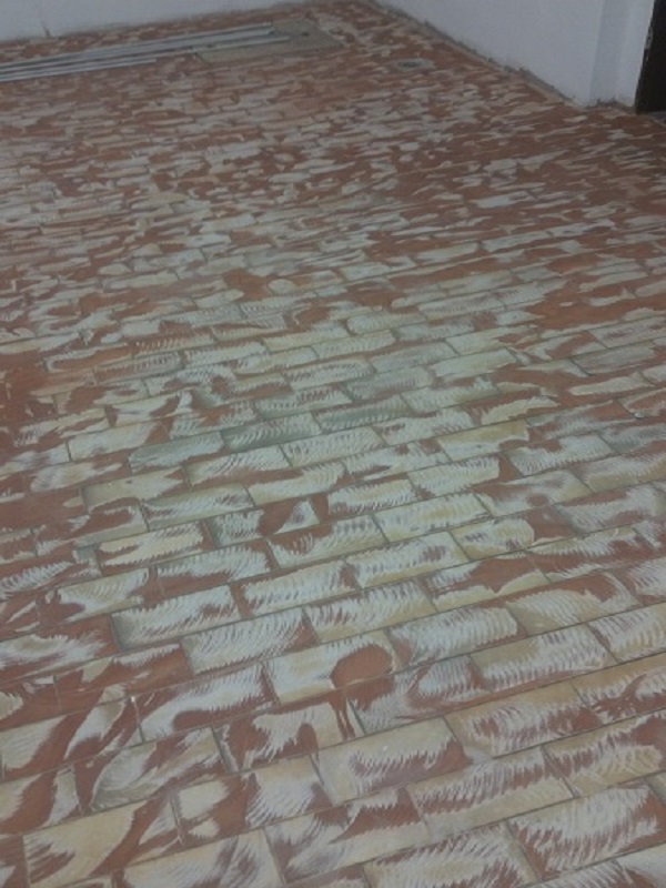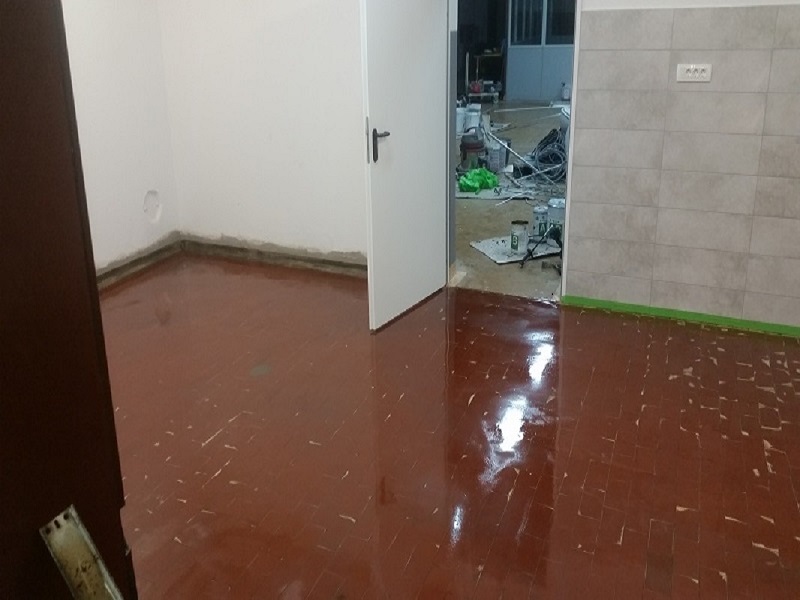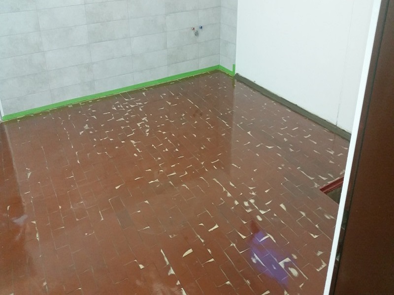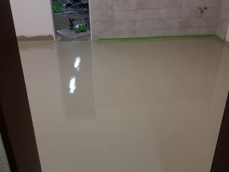 Izvedlava epoksidnega tlaka preko keramike. Hidroizolacija predhodno ni bila narejena, zato je bilo potrebno narediti parno bariero. Podlago je bilo najprej potrebno pripraviti z brušenjem obstoječe keramike ("odpiranje" podlage).